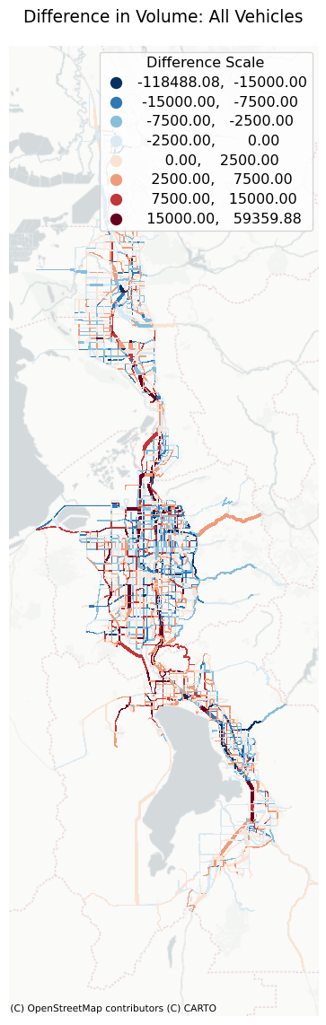 The largest differences in model vs observed volumes occur in the Medium Truck and Heavy Truck vehicle types. A good amount of time was spent attempting to bring model truck volumes closer to observed. However, due to the limited data sources for truck information, further need to investigate observed truck volumes, and a desire to not over-calibrate the model, further calibration was stopped. Truck modeling remains a future priority for model improvement.